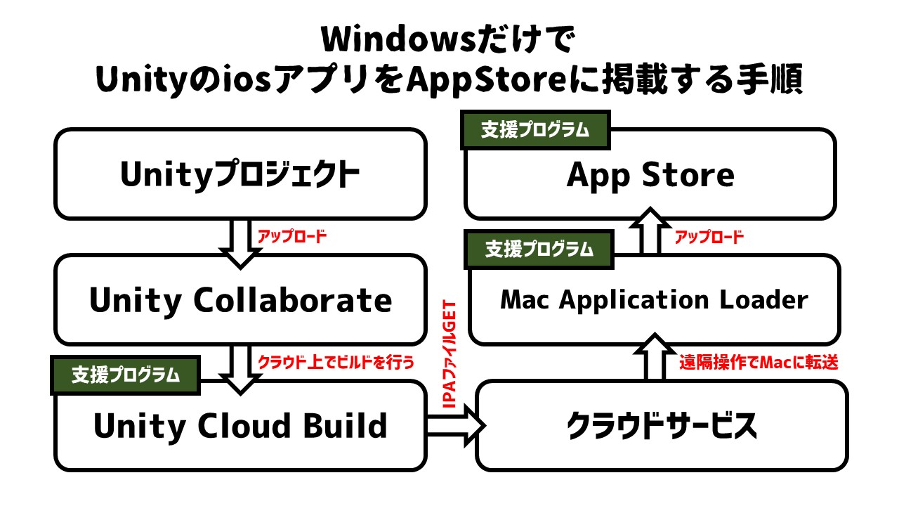 Cloud Build とは、Unity の有料サービスであり、これを用いると、Collaborate にアップロードしたプロジェクトデータを使ってクラウド上でビルドを行い、完成したビルドデータをダウンロードすることができるようになります。これを使って Windows から iOS のビルドデータを簡単に作ることができます。支援プログラムに参加することにより、クラウドビルドを無料でお借りすることができます。クラウドビルドはビルドエラーが発生することが多いため、フルログをしっかり見て、エラーを解消すれば便利に使うことができます。頑張ってください。