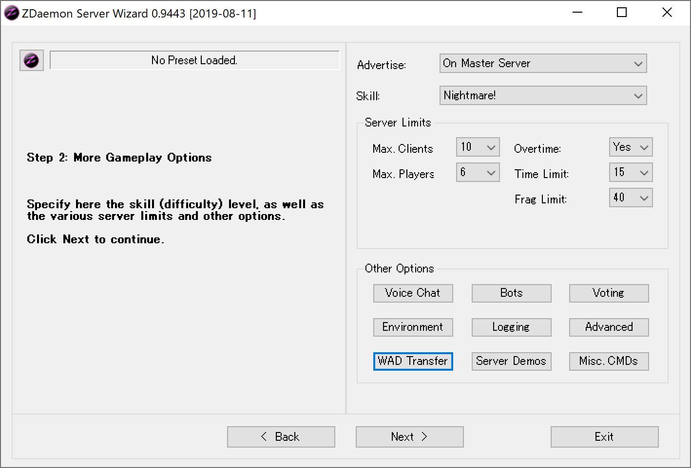 Step 2 画面で、最大の参加人数を変更できます。また「WAD Transfer」から「WAD Downloading Enable」を Yes にしておくと、参加者は WAD をあらかじめ用意する必要がありません。Freedoom の場合は、設定しておくといいかもしれません。