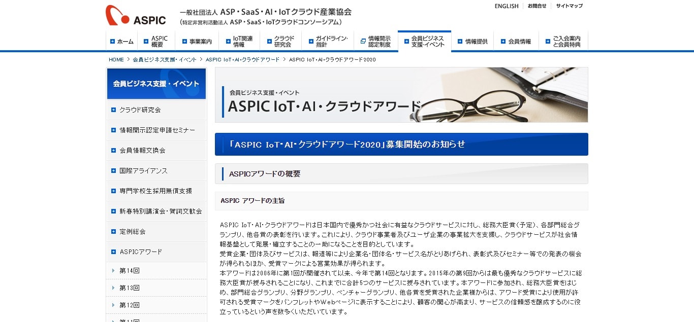 一般社団法人 ASP・SaaS・AI・IoT クラウド産業協会(ASPIC)主催の、ASPIC IoT・AI・クラウドアワード2020 が開催中です。