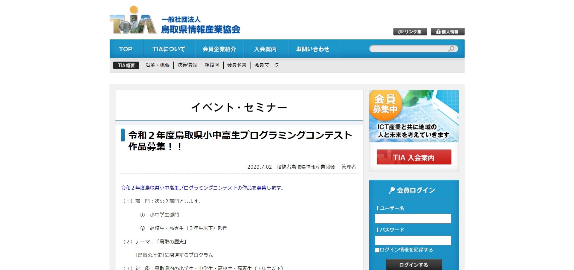 一般社団法人 鳥取県情報産業協会主催の、令和2年度鳥取県小中高生プログラミングコンテスト が開催中です。