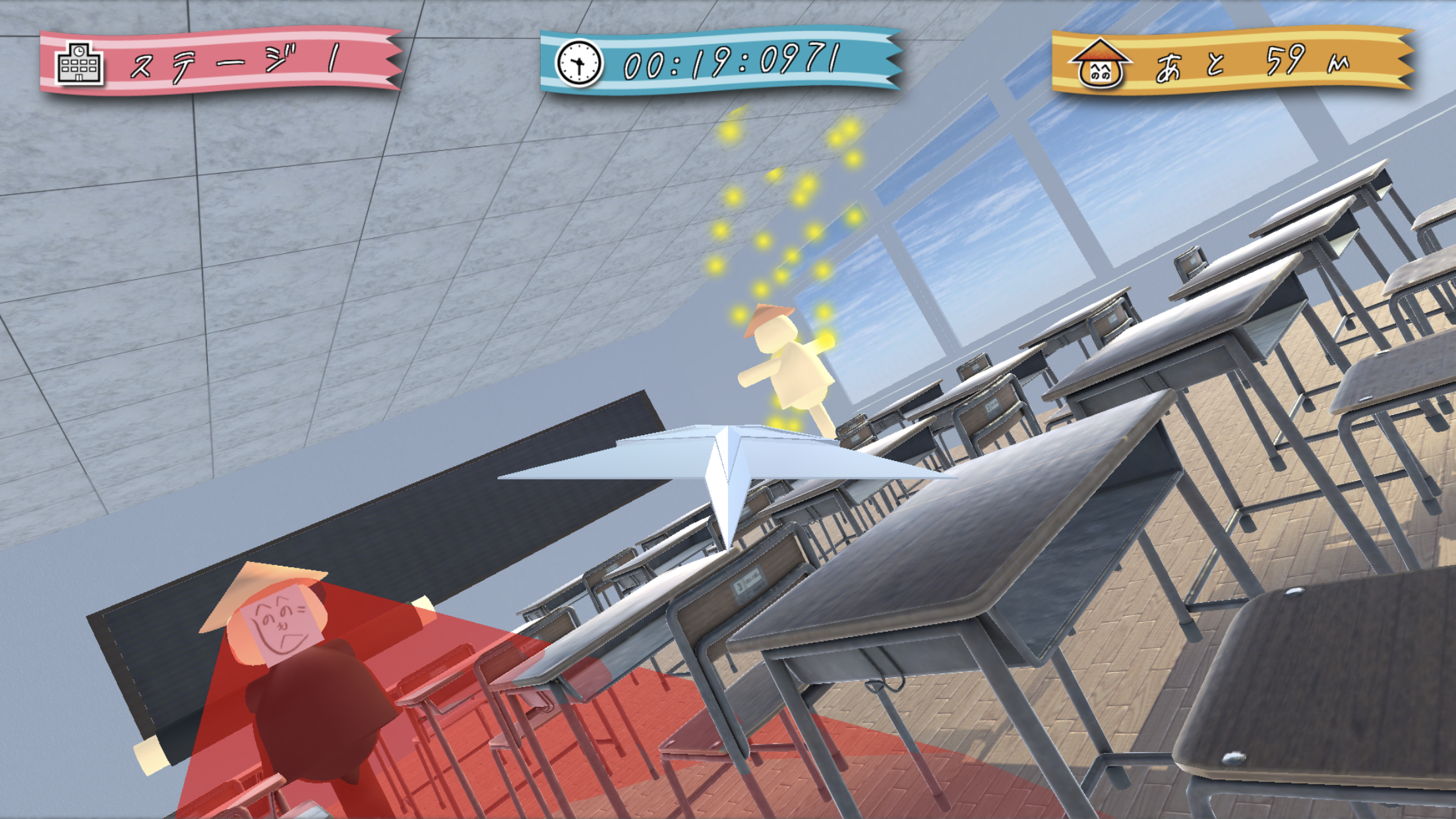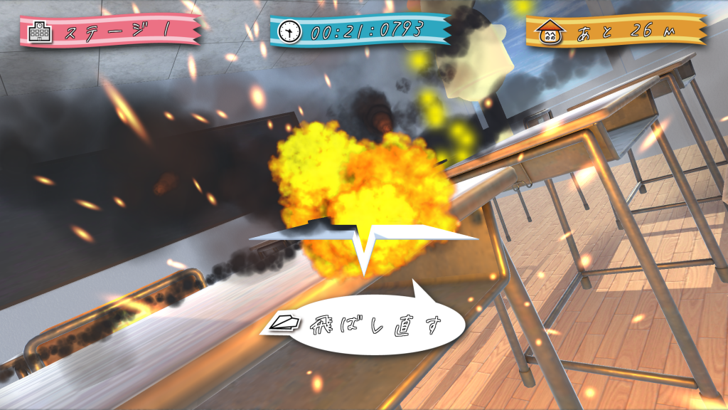 壁や机にぶつかると紙ヒコーキが爆発しますが、先生にバレない限りは何回でも飛ばし直すことができます。ステージが上がると机や椅子の配置と先生の数が……!?