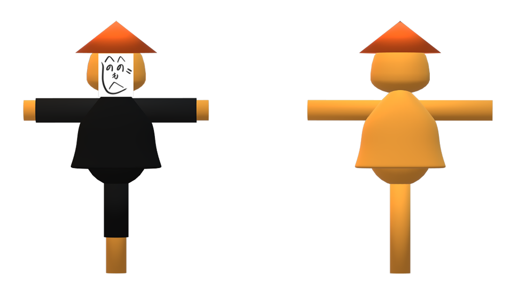 黒い案山子が先生、普通の案山子が鈴木。先生の視界(赤い光)に入ってしまうとバレるので避けましょう。