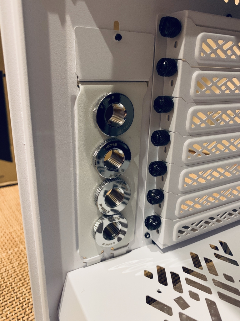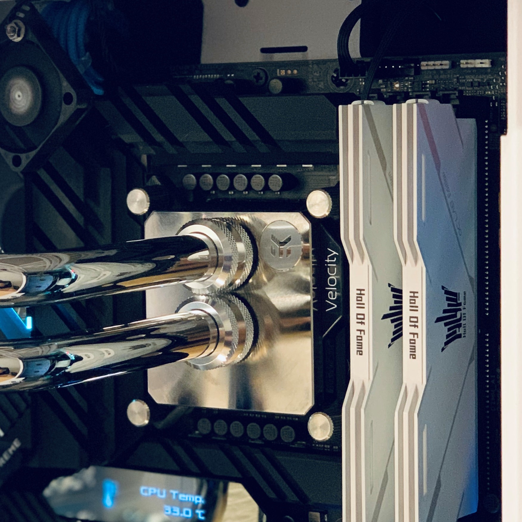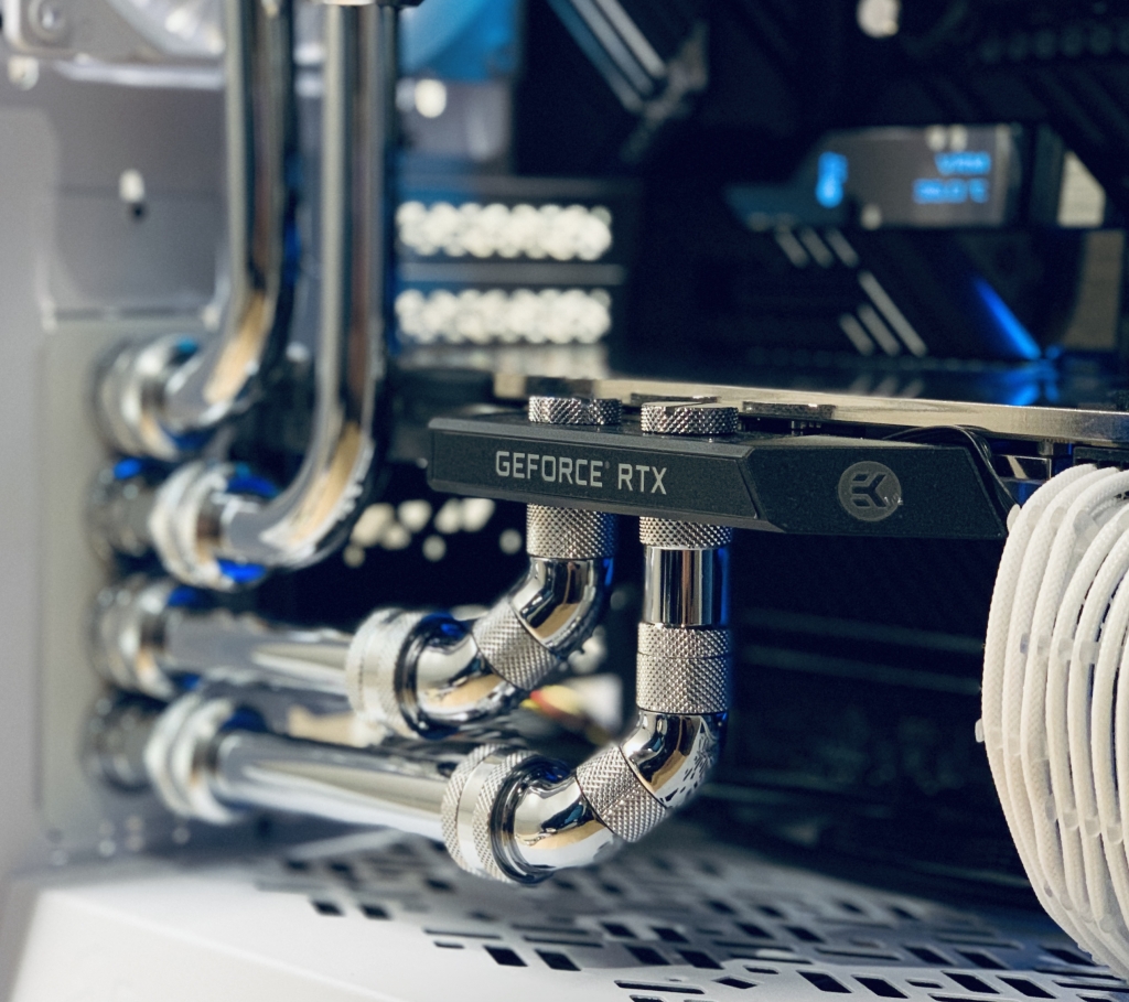 ゆきみ 概要で触れたように、「ゆきみ」のイメージに合わせて PC の配色も”白””銀””青”を取り入れています。ホワイトの筐体をベースに、CPU 水枕や冷却水が流れる真鍮のハードチューブ、GPU バックプレートはシルバーでまとめています。
