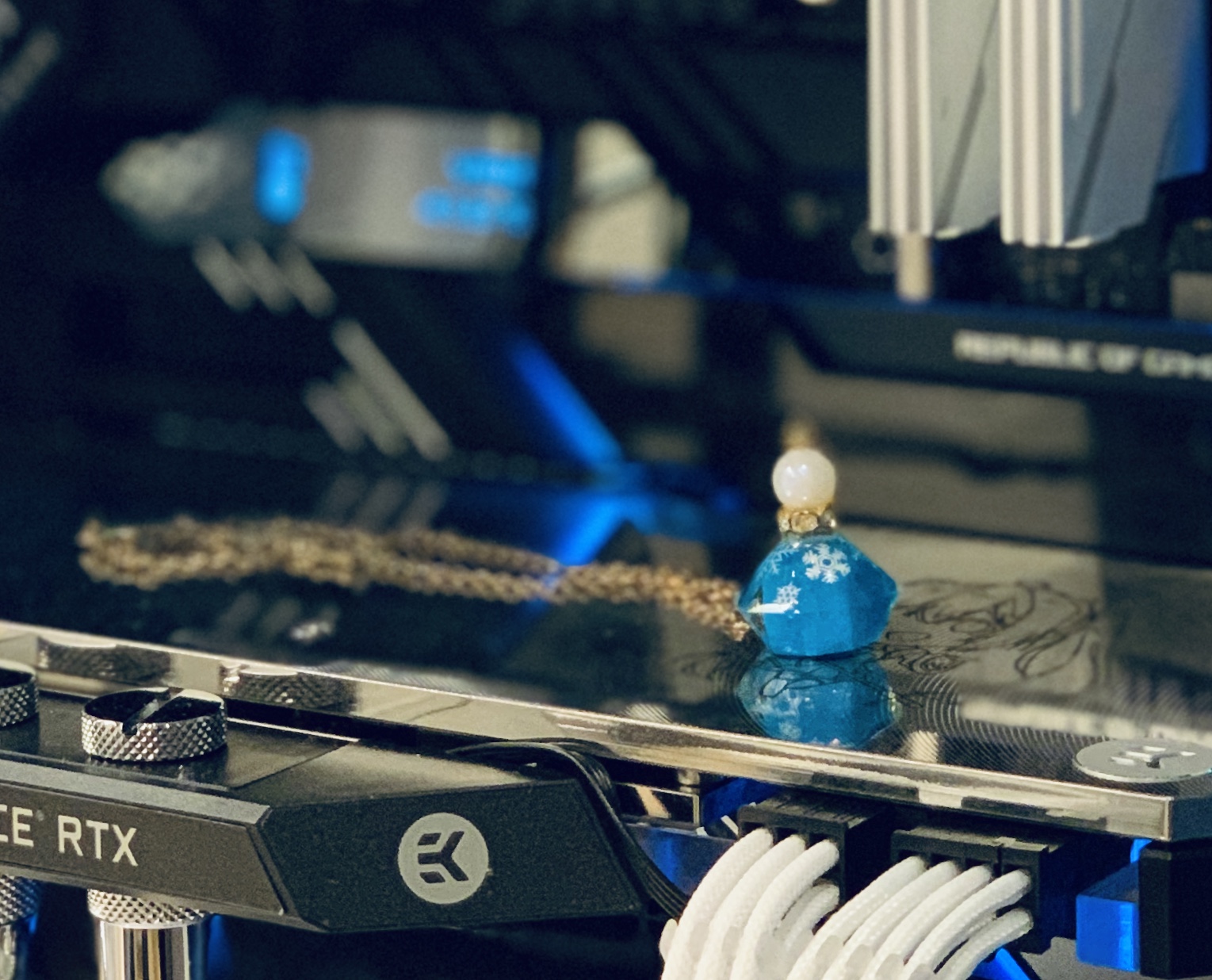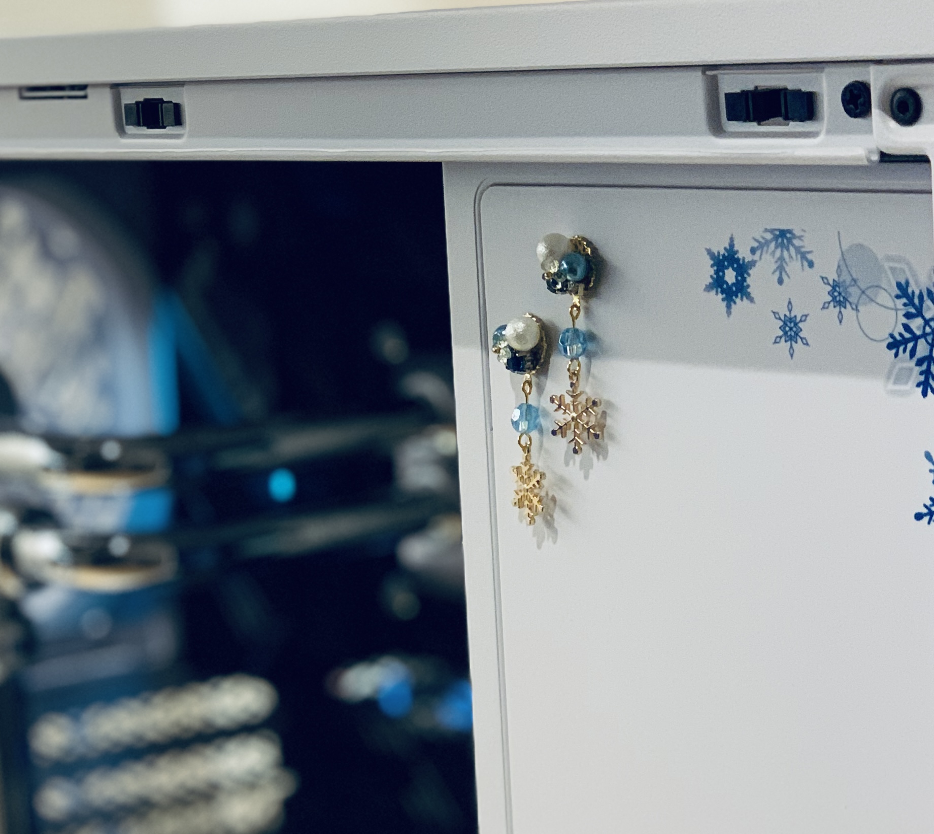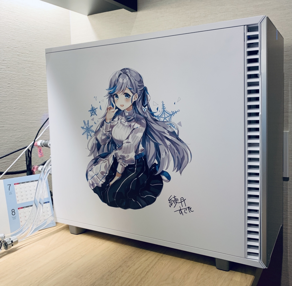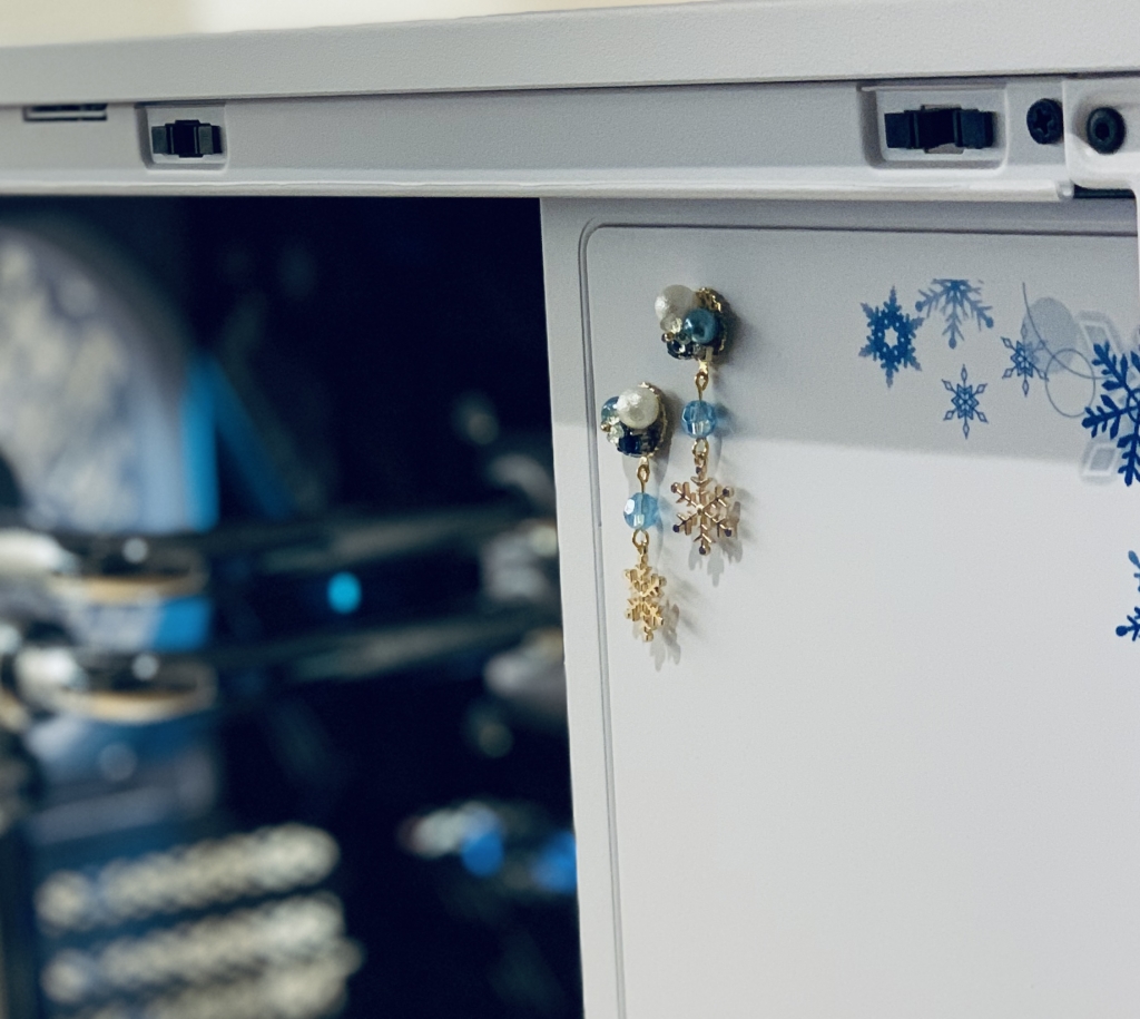 ゆきみ 私自身のキャラクター「鈴守ゆきみ」をモチーフにした、ゲーミング MODPC です。ゆきみのイメージカラーが”白””銀””青”の3色なので、PC本体の配色にも取り入れています。ケース側面のパネルを付けても楽しい、外しても楽しい PC を目指しました。