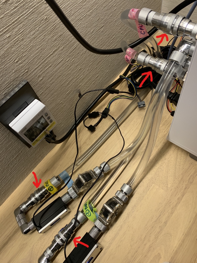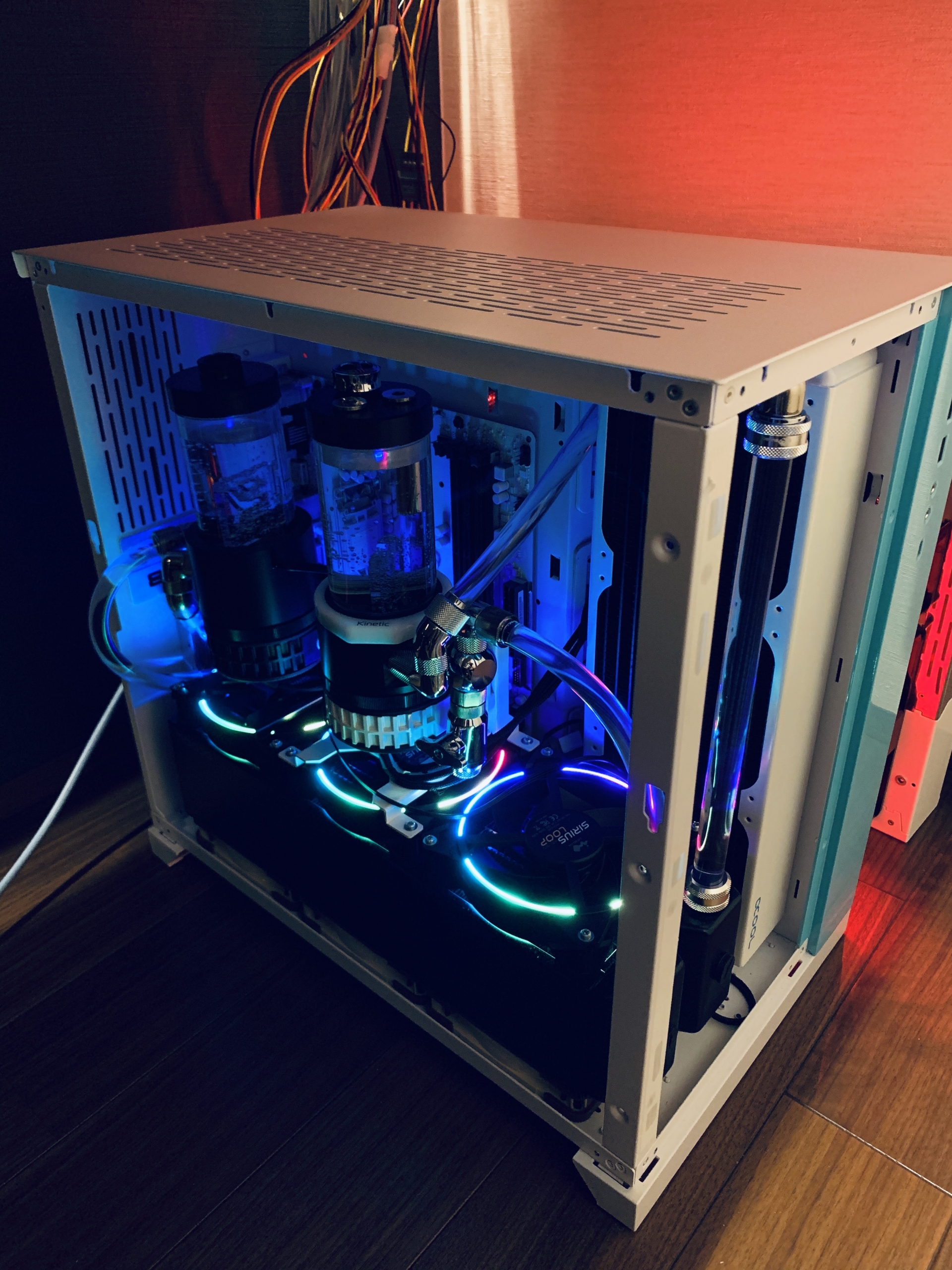 設置場所にもちょっとしたこだわりがありまして、PC 本体は机上に設置しデスク足元に置かれている冷却装置へソフトチューブで接続した高低差のある循環様式をとっています。この様式をとった理由ですが、ひとつは単純に部屋の中で低いところ、つまり足元付近にラジエターを設置した方がより冷たい空気を取り込みやすく、冷却力強化を期待できると考えたからです。もう一つは、PC ケース内部にある配管の継ぎ目部分を極力減らしたかったというのがあります。これは万一水漏れした際の、他のデバイスへのダメージリスクを低減したかったというのが理由です。