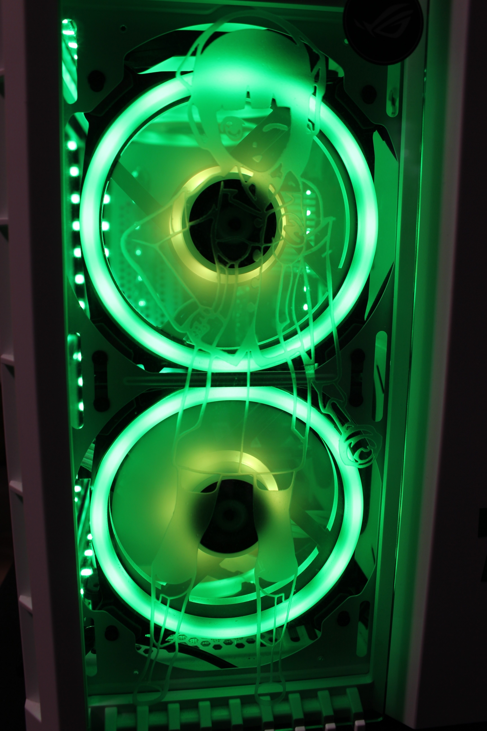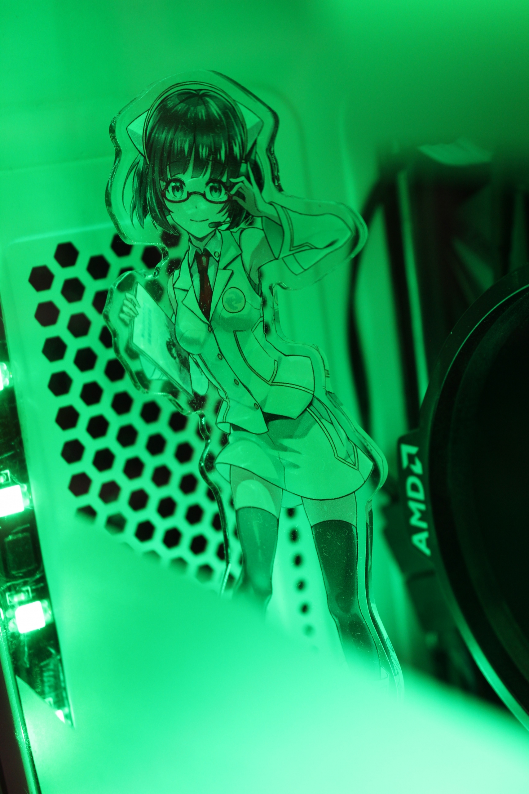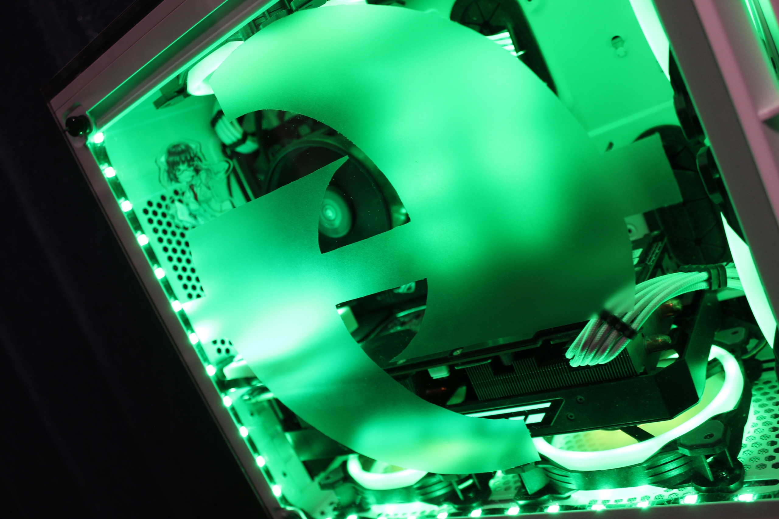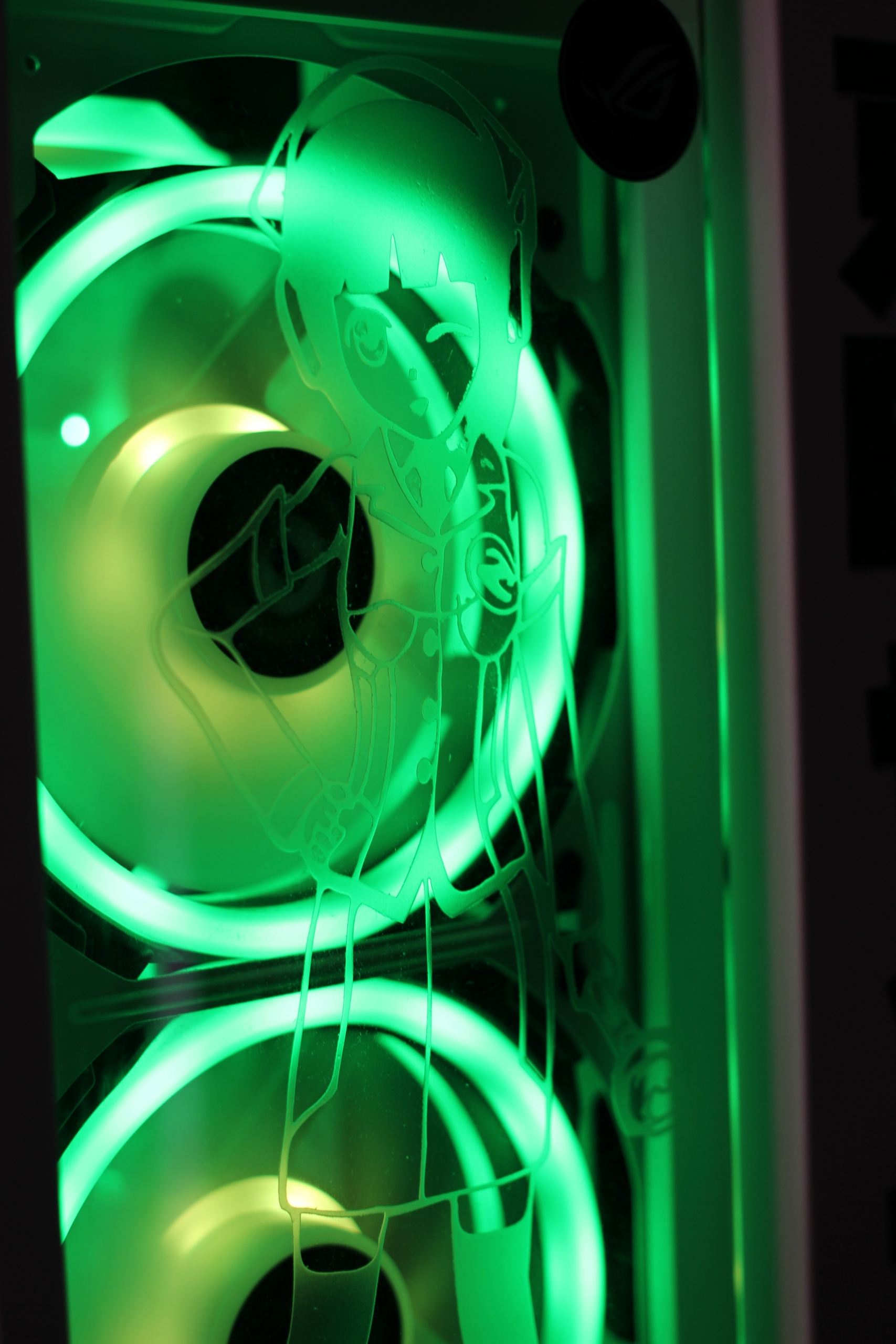 鈍ザンキ こだわりポイントその1! あまり時間がない中でPCパーツを塗装したり UV プリントしたパネルを作ったりなんかは時間と手間がかかるので、何か手軽にキャラクターを表現できる方法はないかなと考えた結果、くもりガラス用スプレーを吹きかけるという方法にしました。PC 内部は京町セイカのイメージカラーである緑色にすることは決まっていたのでくもりガラスのようにすれば緑色の光も拡散していい感じになるかなという点も決め手の一つです。