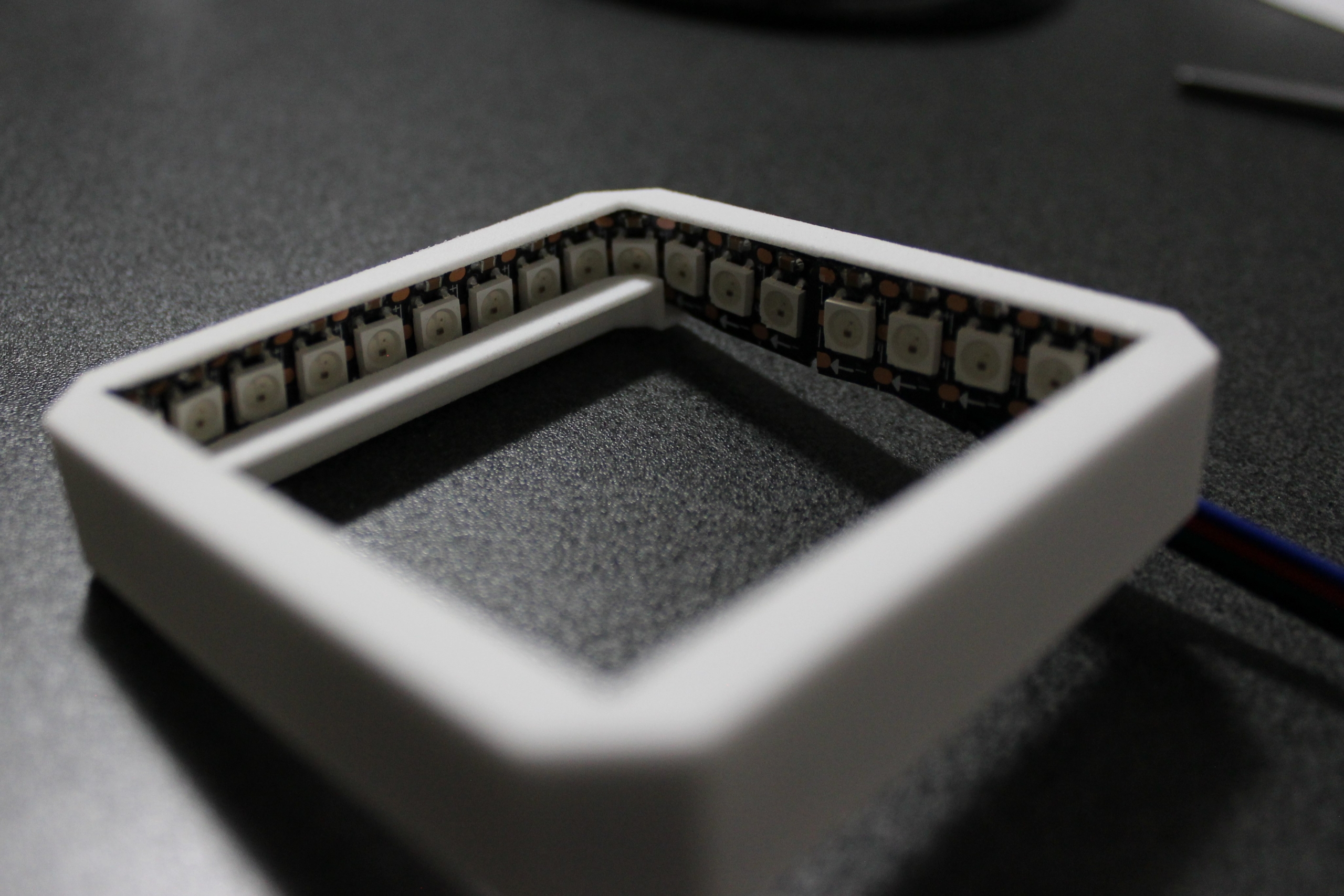 鈍ザンキ こだわりポイントその3! アクリルスタンドの置台です! 3Dプリンターを使って枠を作り、中に LED を仕込んでいます。さらに磁石を取り付けているので PC 内どこでも設置できるようになっています。LED はマザーボードから制御できるのでいろんなライティングができちゃいます!