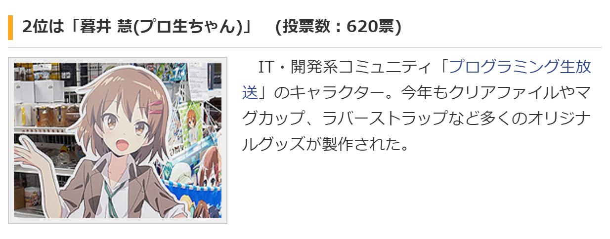 暮井 慧(プロ生ちゃん)は、620票の2位でした。投票してくれた皆さんありがとうございました。これからも応援よろしくお願いします。