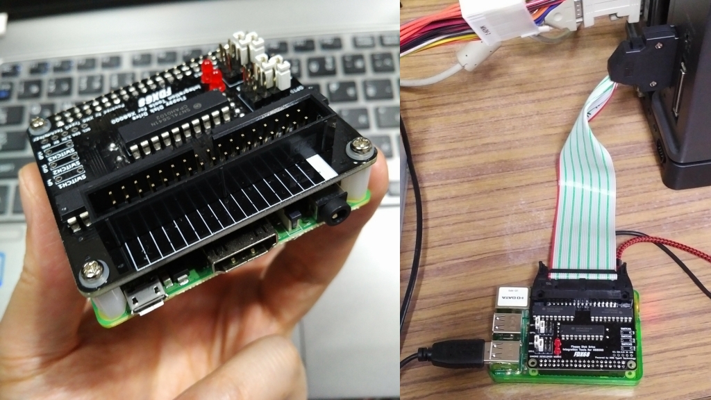 FDX68は、本来、このように外付けで接続します。(左: Raspberry Pi3 MODEL A+と接続 / 右: Pi 3 MODEL B+と接続)
