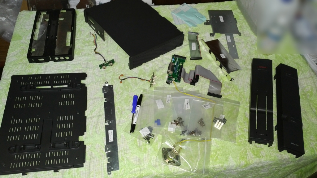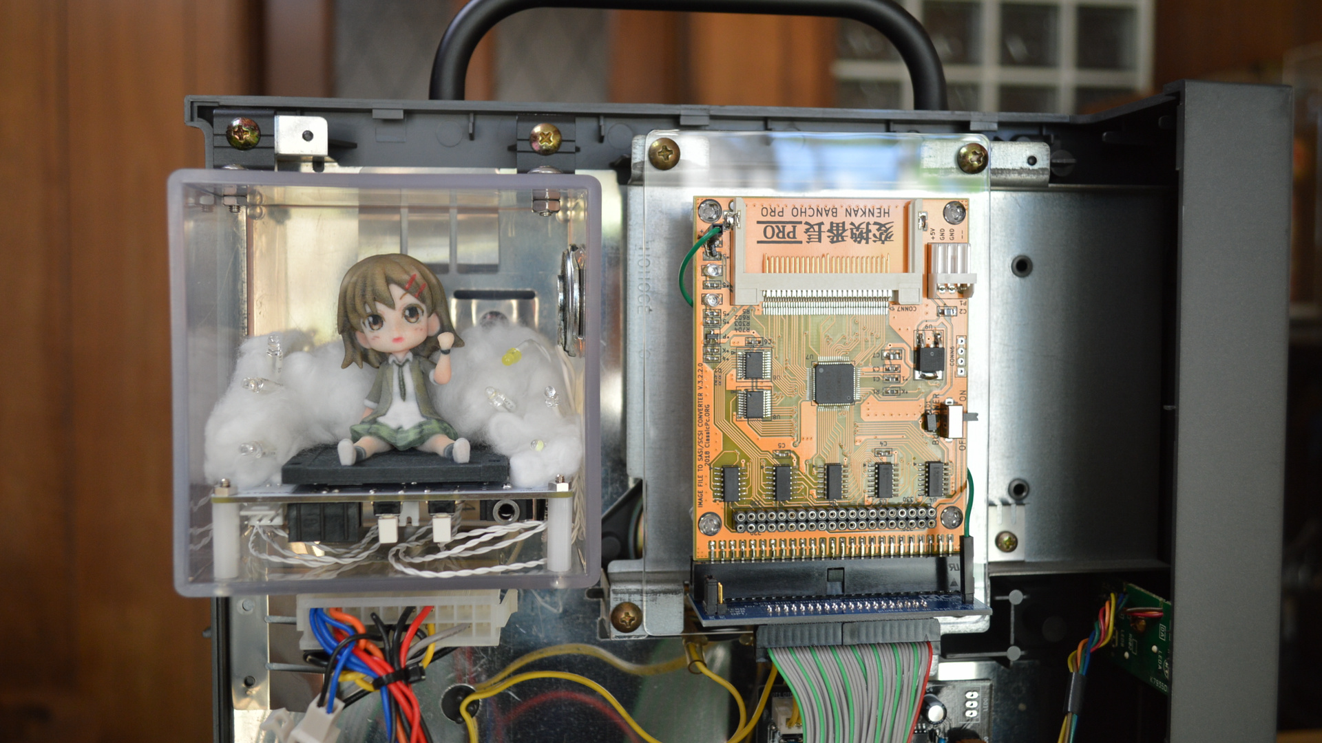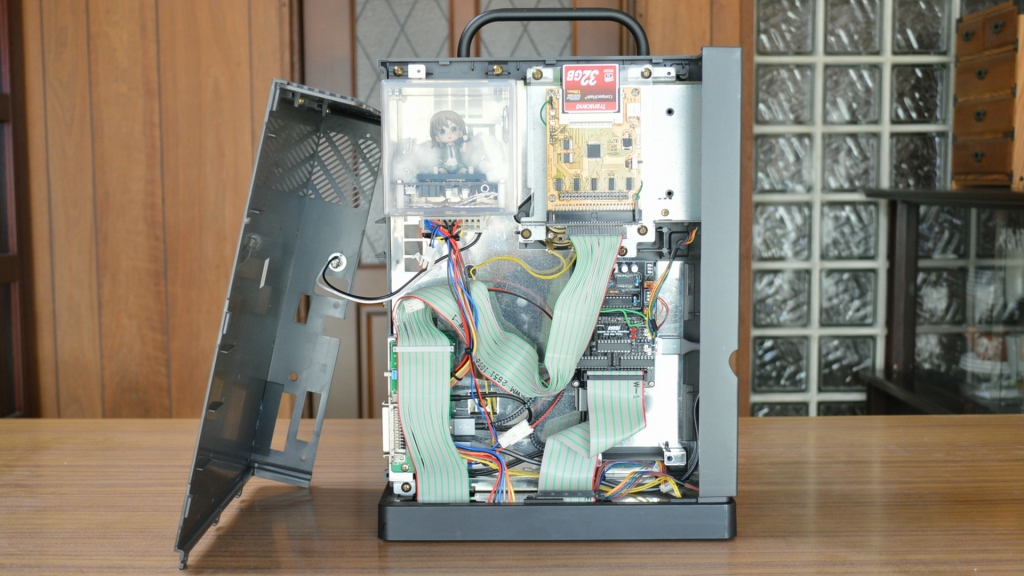 EXCEED. 電源と FD ドライブが抜かれたジャンク状態で、ネットオークションに出品されていたレトロ PC「X68030」を入手し、それをリビルド(修理&洗浄)して、失われてしまった FD ドライブの代わりに、FD ドライブエミュレータを内蔵させ、電源装置の空きスペースを使用し、本体内に「しゃべる」プロ生ちゃんフィギュア(基板)を入れました。