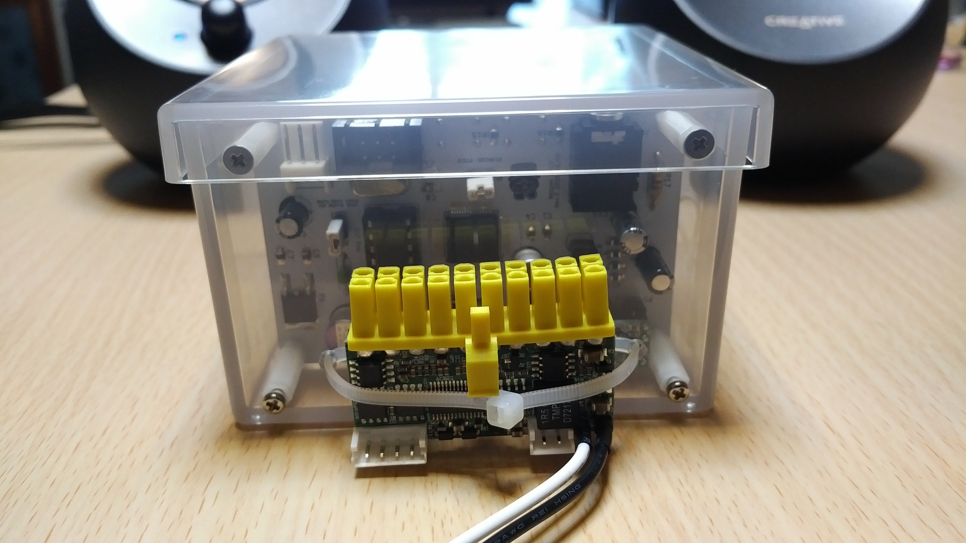 picoPSU の形状の問題で、ねじ締め固定ができないため、プロ生ちゃん基板ケースの外に強力テープで貼り付け、結束バンドで落下防止対策を行っています。