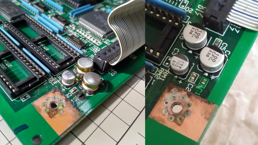 コンデンサ交換。経年劣化したコンデンサから電解液が漏れ出した状態で通電したものと思われるショートによる炭化および、腐食した状態の基板と(左画像)それを修理したもの(右画像)