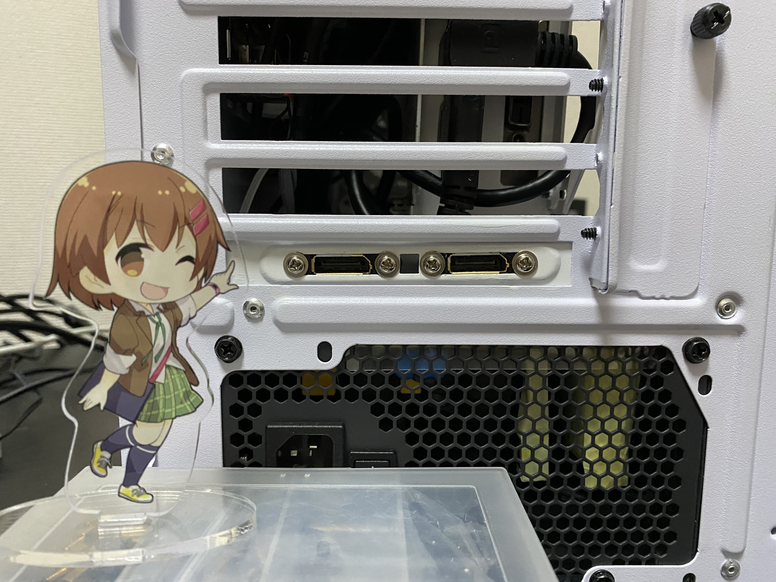 しろラボ しろたん=白なので、白を基調にしさりげなく可愛くで纏まりのある構成を考えながら作成を始めました。まずは、ケースをしろたんのマスキングテープでの縁取り装飾&ステッカーですね。制作時間があまり無かった為少し雑になりましたが、どうしたら違和感無く可愛く作れるのかを意識しながら作成しました。次に、この PC ケース FARA R1 は ATX ケースの割に小さくて狭く GPU 縦置きの出来ないケースなので、GTX1070 をどう縦置きするのかとても苦労しました。GPU 縦置きスタンドを固定する際にグラグラしないように加工し完全固定をしたり、DisplayPort×2ポート移設拡張カードブラケット自作して見た目を良くしたり何度も作り直しをして何とかツライチで GTX1070 を縦置き出来ました。この経験を、次に組む本格水冷 MOD-PC に活かしたいと思っています。