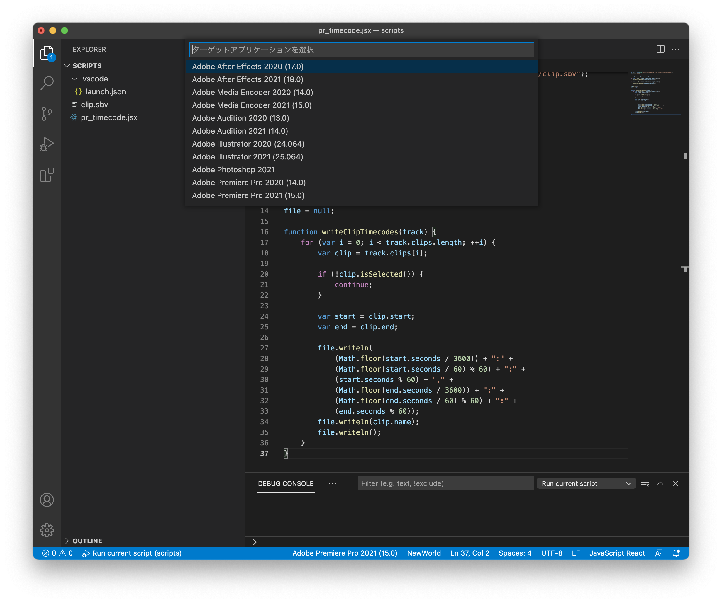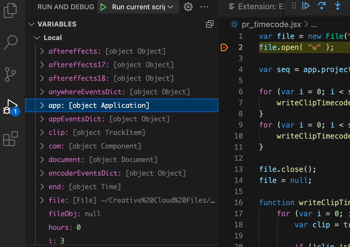 ブレークポイントで、実行の途中で止めると、Premiere Pro のオブジェクトの情報を Debug ビューの variables から見れるから、どんな情報を取得できるか調べるのに役立つよ。