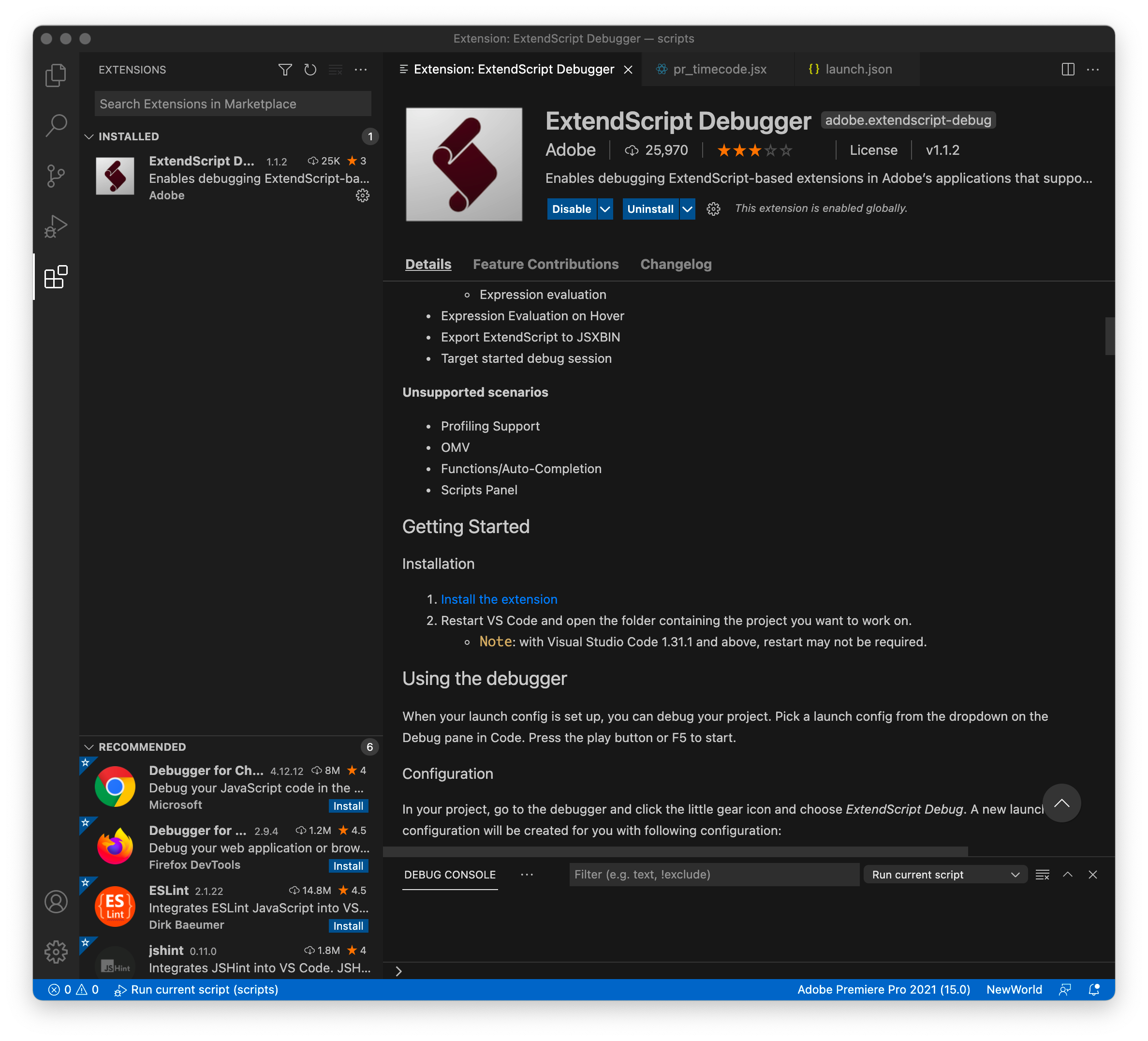 Visual Studio Code で、ExtendScript Debugger をインストール。