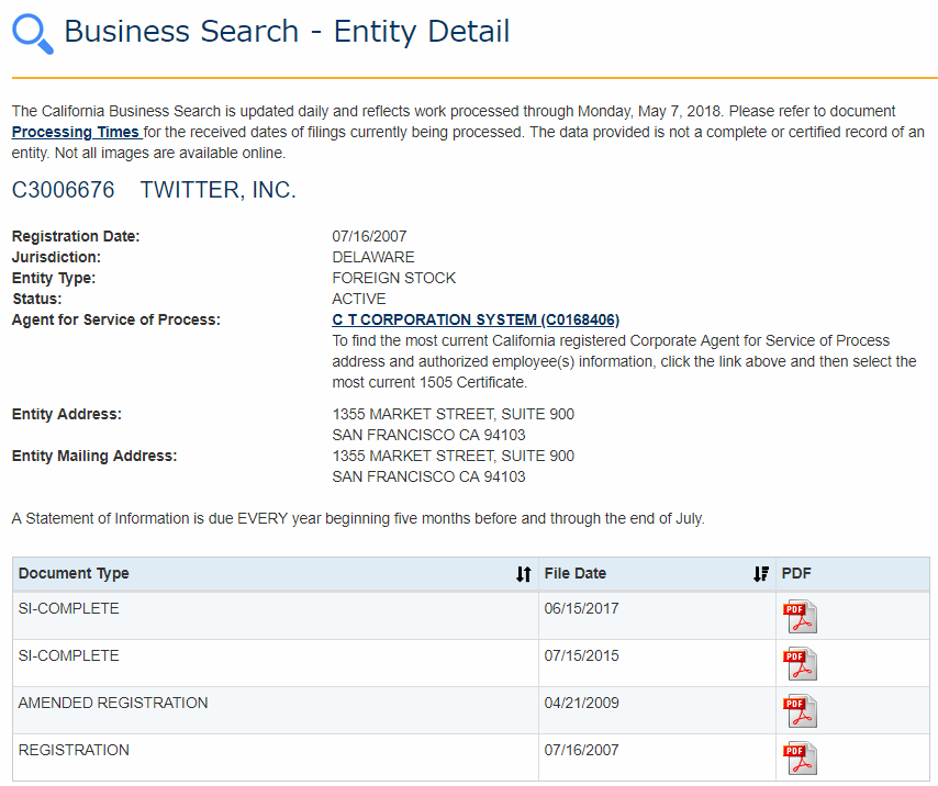 結果結果から ACTIVE な「TWITTER, INC.」を選ぶと Twitter 社の企業情報と PDF へのリンクが表示されます。