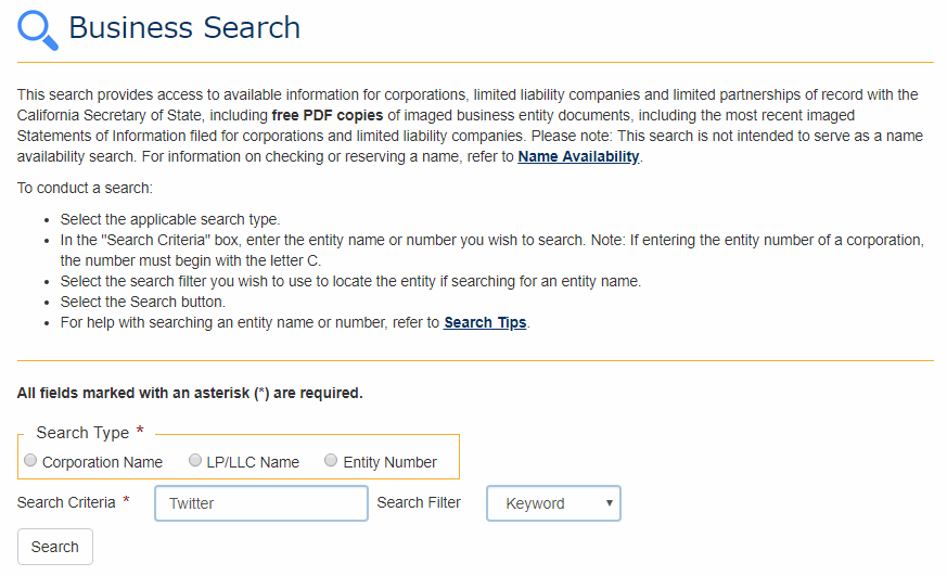 企業情報の PDF 自体は、カリフォルニア州長官の Web サイトの Business Search から検索して、無料でダウンロードできます。