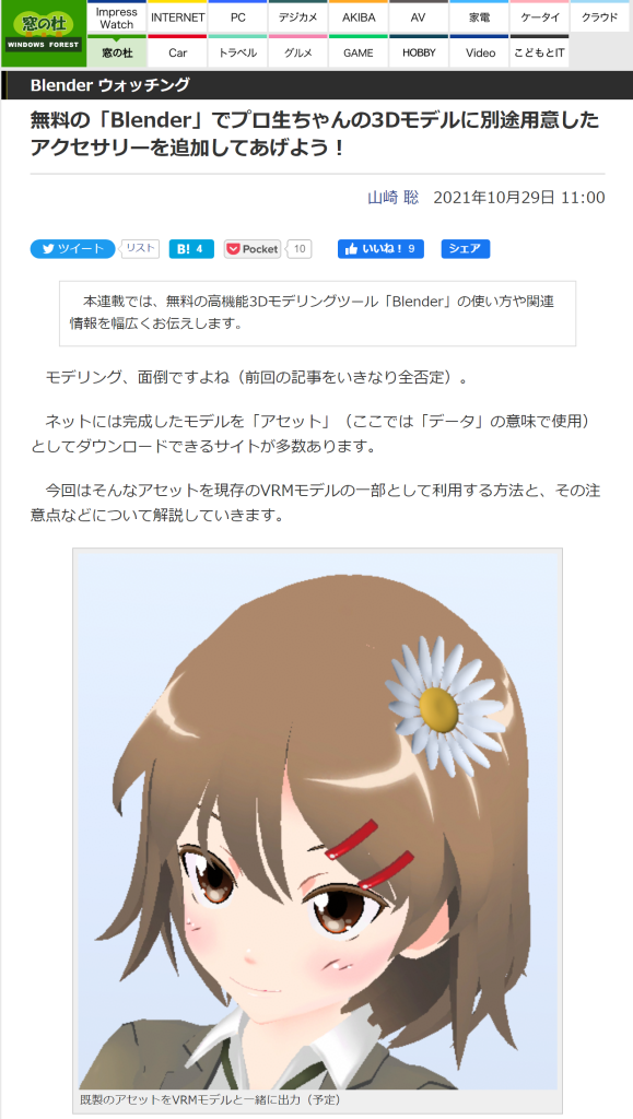- 10月29日: 無料の「Blender」でプロ生ちゃんの3Dモデルに別途用意したアクセサリーを追加してあげよう! - Blender ウォッチング - 窓の杜