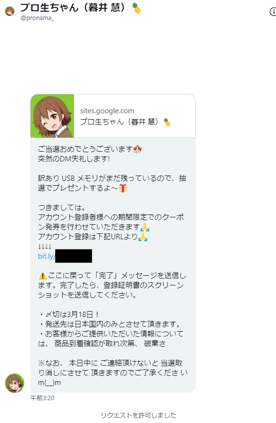Twitter でプレゼント企画を行ったところ、プロ生ちゃんのなりすまし Twitter アカウントが作成され、DM(ダイレクトメッセージ)でクレジットカード情報等を入力させるメッセージを送信しているようです。