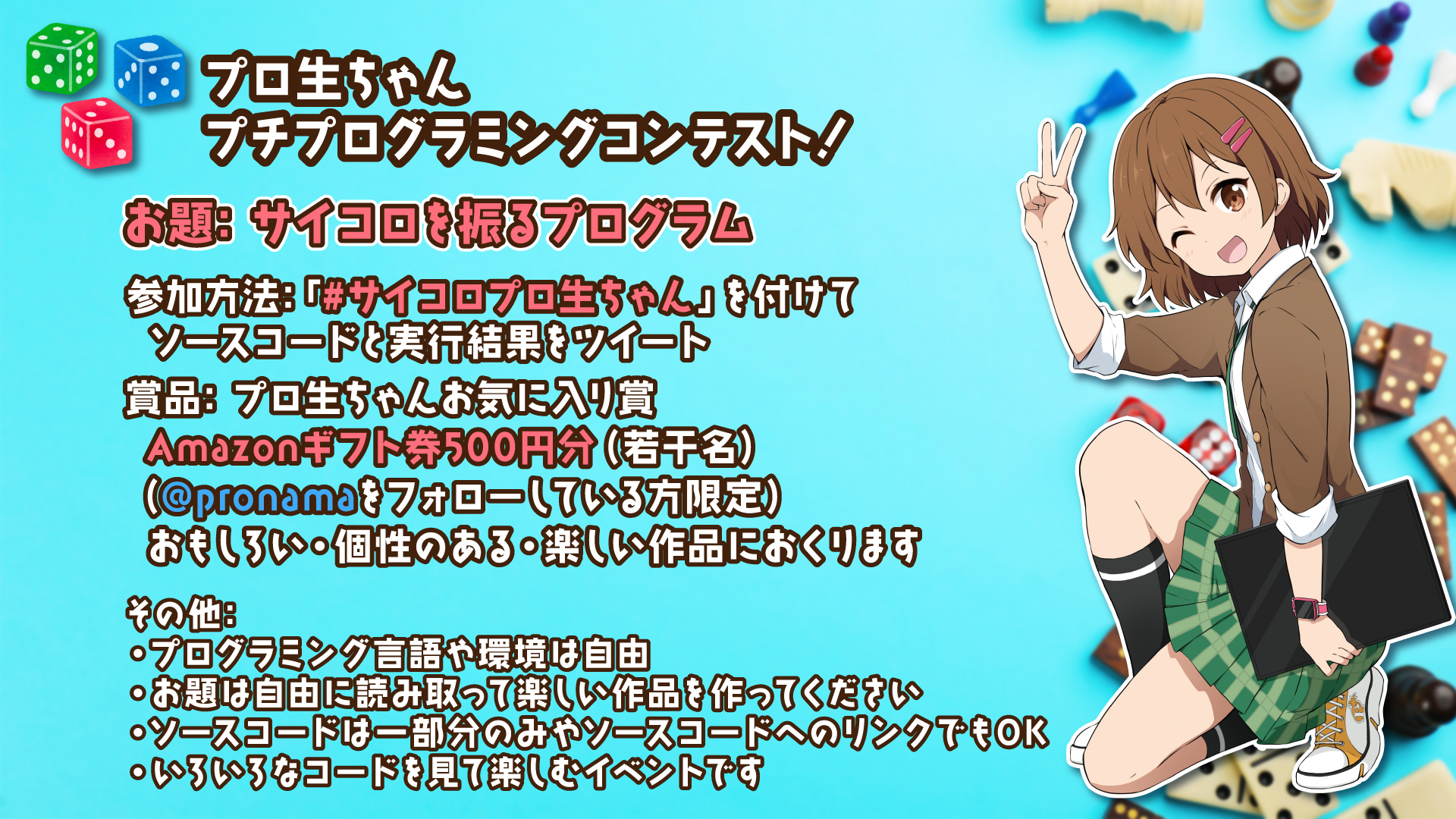 - 参加方法: 「#サイコロプロ生ちゃん」を付けてソースコードと実行結果をツイート