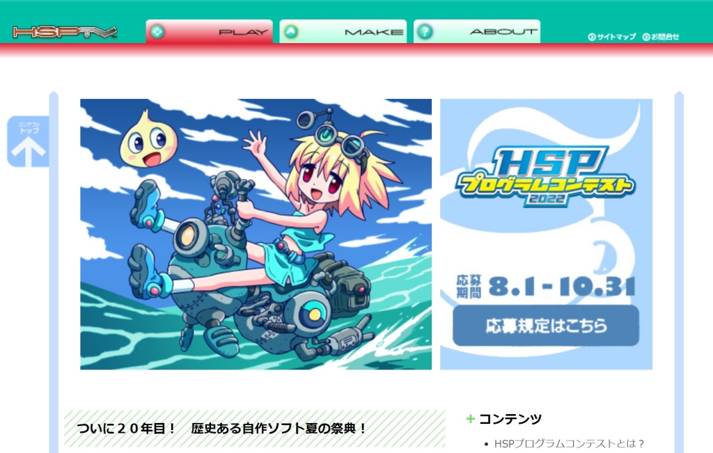 HSP プログラムコンテストは、プログラミング言語「HSP」を使った作品を募集して表彰するイベントです。20年の長い歴史を持ち、すべての応募作品は無料でダウンロード公開されています。作品を見てみたいという人も大歓迎。 HSP を使っている人も、そうでない人も自由に参加して楽しめます。