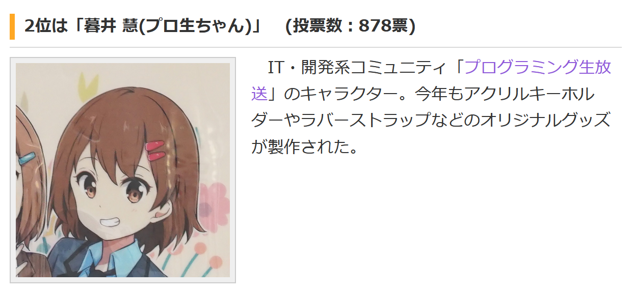 暮井 慧(プロ生ちゃん)は、878票の2位でした。投票してくれた皆さんありがとうございました。これからも応援よろしくお願いします。
